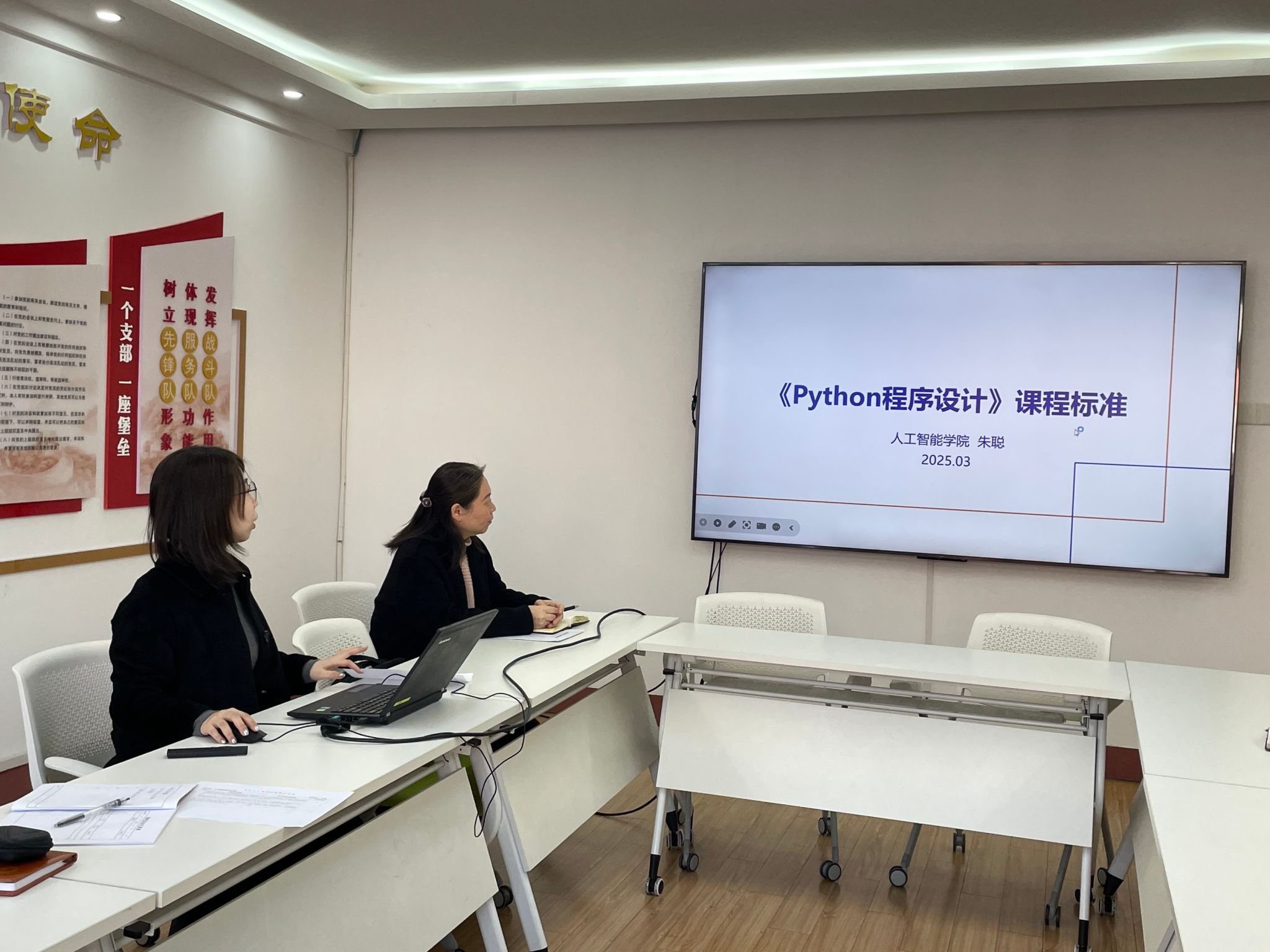 随后,朱聪老师又进行了《Python程序设计》课程标准汇报。汇报内容涵盖课程基本信息、目标与定位、教学内容与实施、教学方法创新、考核评价体系、课程资源建设、存在问题与改进措施以及总结与展望八个方面。通过全面深入的汇报,为公司在该课程的教学改革与发展方向提供了清晰的指引。