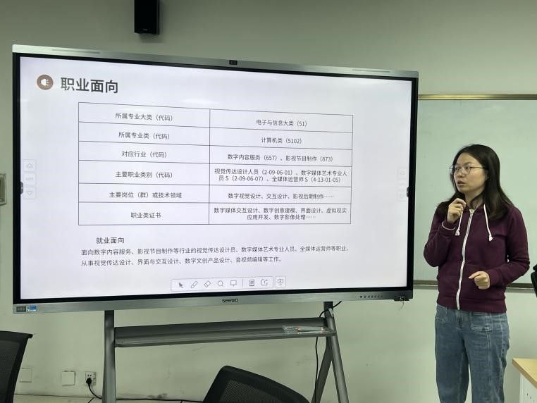 主题分享中,数字媒体技术专业负责人高子砚围绕专业的人才培养方案作了主题汇报。她从职业面向、就业前景、培养目标等方面入手,深入剖析了该专业所需的专业技能、知识要求及能力要求,并系统介绍了专业教育课程体系与实习实践安排。