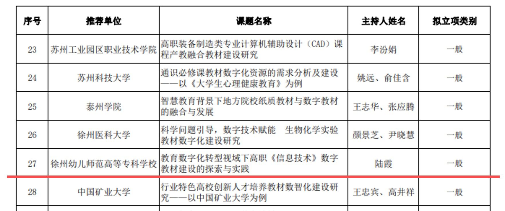 近日,2024年江苏省高校“新时代教材数字化建设研究”专项课题评选结果公示,公司副经理陆霞申报的《教育数字化转型视域下高职<信息技术>数字教材建设的探索与实践》获批立项。根据《关于做好2024年江苏省高校“新时代教材数字化建设研究”专项课题立项建设申报工作的通知》(苏高教会〔2024〕19号)文件精神,各高校及研究会限额申报推荐课题共149项。经江苏省高等教育学会组织专家评审,拟立项建设专项课题75项,其中,重点课题5项、一般课题70项。