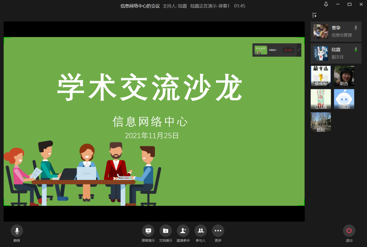 20211125日下午,信息网络中心全体教职工召开了线上学术沙龙研讨会。就近期中心教职工科研情况进行汇报和总结,会议由中心副主任陆霞主持。